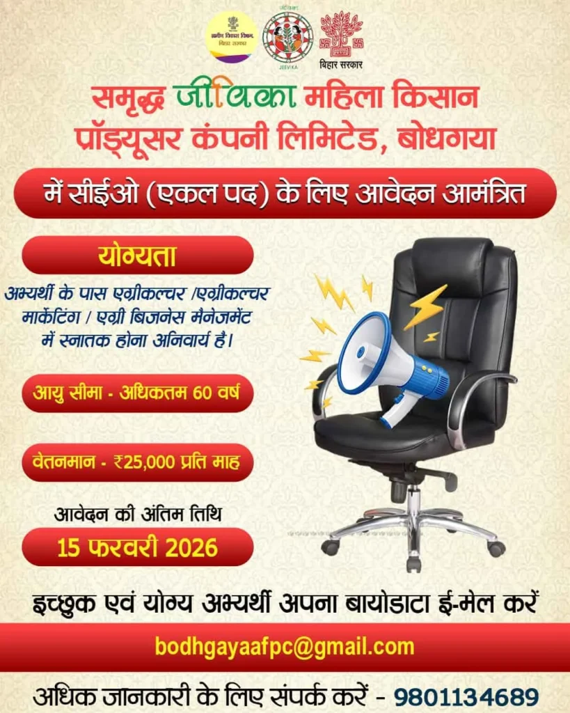 | भर्ती का नाम | Samriddh Jeevika Mahila Kisan Producer Company Bharti 2026 |